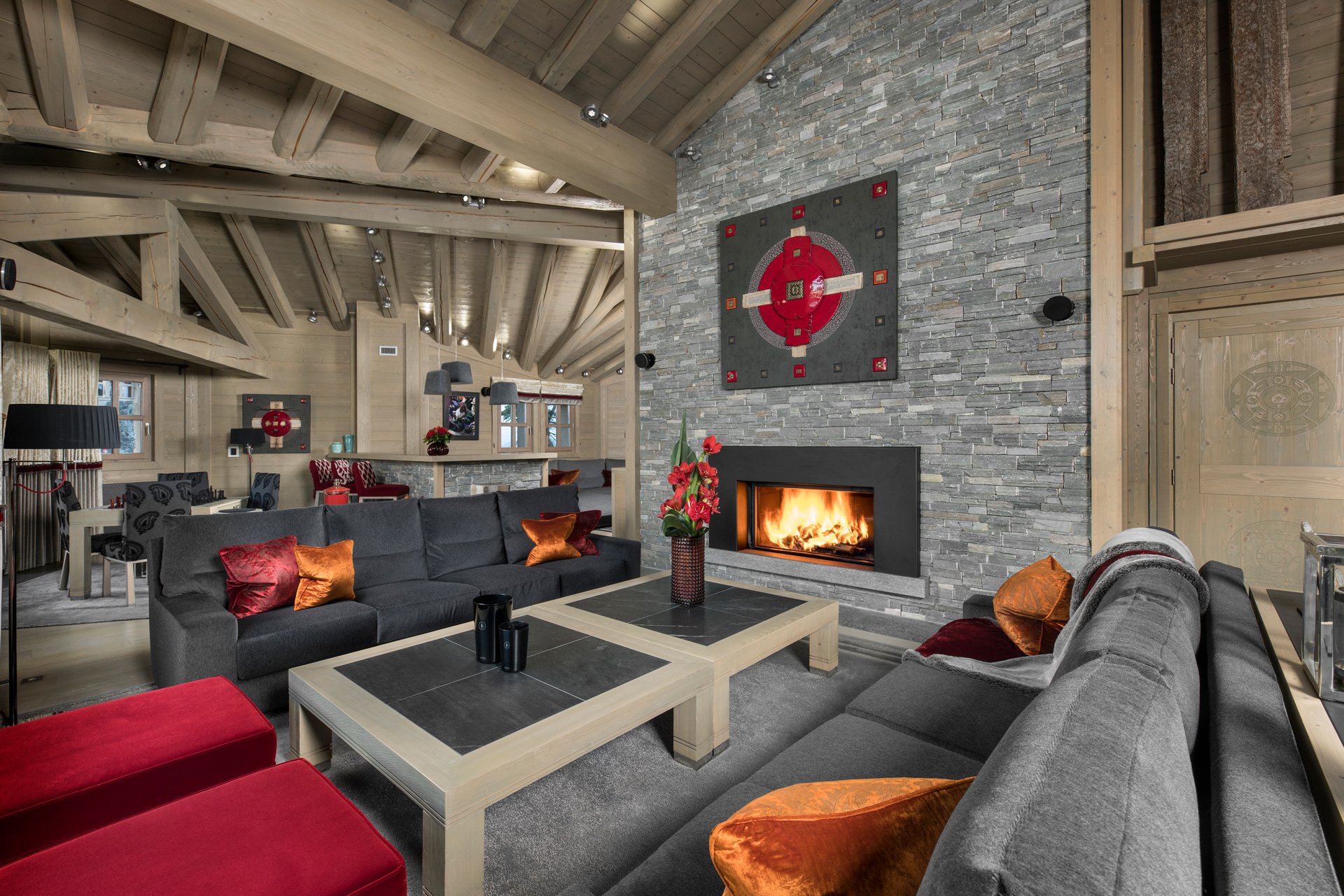 The entrance to the chalet is on the upper floor where there are two sittings areas with large bay windows, vaulted ceilings and an open fireplace.