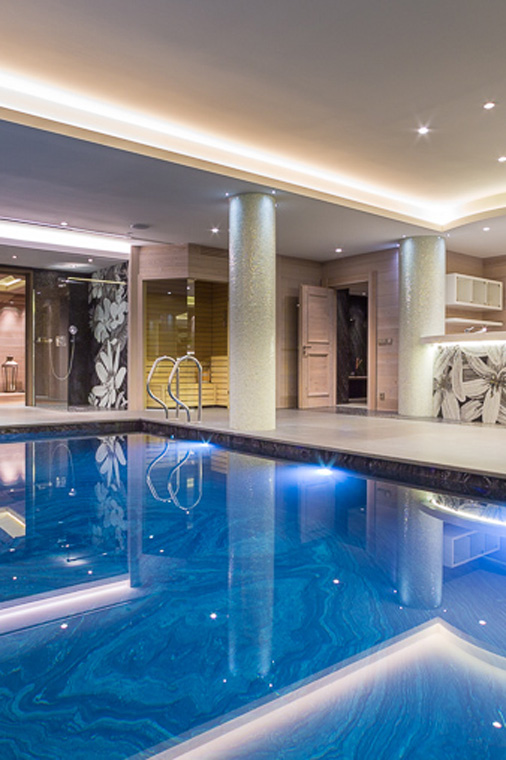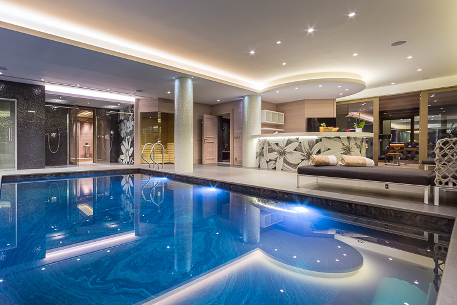 The highlight of this chalet is its five-star spa area. It comprises an extra-large indoor swimming pool, subtle lighting, a relaxation area and bar, a hammam and sauna, two showers, a dressing room and a well-equipped fitness room.